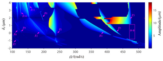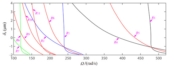 Figure 12 shows the power spectra of the dynamic displacement parameter (DDP) [9]: DDP = xpeak-to-peak + ypeak-to-peak, where xpeak-to-peak = x(t)max − x(t)min, and ypeak-to-peak = y(t)max − y(t)min. To reflect the hysteresis characteristics, here the larger DDP values are selected from the two DDP values obtained as the controlled parameter Ω runs up and down. It is clear that the system contains many types of VC parametric resonances. From Section 4.1, some resonance types of the two degrees-of-freedom of the system have been confirmed, such as the primary resonances (i.e., R1 and R2), 1/2-order subharmonic resonances (i.e., R3 and R4), 2-order superharmonic resonances (i.e., R6 and R7), and the case of ωx0 + ωy0 = ΩVC combination resonance (i.e., R5). Moreover, the cases of 1/2·(ωx0 + ωy0) = ΩVC combination resonance (i.e., the 2-order summed type of combination resonance [39,57]) and 1/2·(1/4·ωx0 + ωy0) = ΩVC combination resonance (labelled as R8 and R9, respectively) were found in our recent work [25]. As shown in Figure 13, these resonant locations can be predicted well by the equivalent resonant frequencies ωx0 and ωy0 from the arithmetic mean of Equation (8) at Ω = 700 rad/s, where we assume that the system is far from any resonance when Ω takes 700 rad/s to achieve an almost linearized dynamic stiffness (7). In addition, there are the other cases of 1/2·(1/2·ωx0 + ωy0) = ΩVC and 1/2·(ωx0 + 1/2·ωy0) = ΩVC combination resonances (labelled as R10 and R11, respectively) excited as the bearing clearance δ0 increases beyond 2.0 μm.