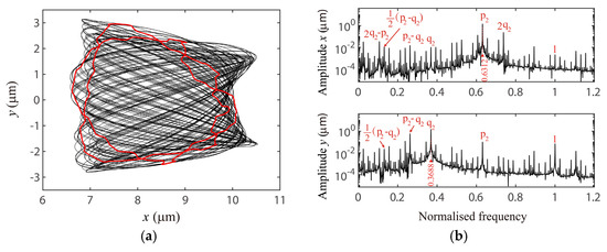 For δ0 = 1.5 μm, response characteristics of the VC period-2 motion when Ω = 330 rad/s, (a) orbit (black line) and its Poincare mapping (red dots), (b) time series and their frequency spectra.