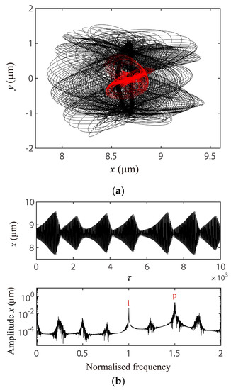 For δ0 = 1.5 μm, response characteristics of the VC period-1 motion when Ω = 310 rad/s, (a) orbit (black line) and its Poincare mapping (red dots), (b) time series and their frequency spectra.