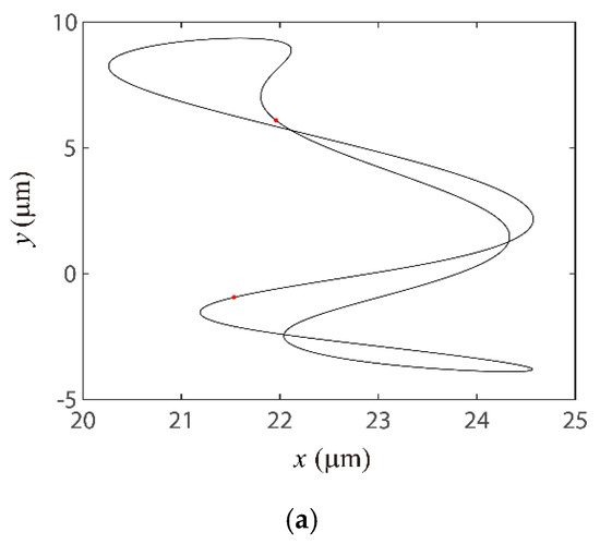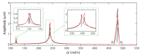 Comparing Figure 12 and Figure 13, it is clear that not all cases of the predicted VC parametric resonances will be excited; for example, the predicted 1/2-order subharmonic resonance R3 in the interval a-a. For δ0 = −1.1 μm, the equivalent resonant frequencies of the system are about ωx0 = 1921.18 rad/s and ωy0 = 1915.54 rad/s, and only three resonance amplitudes emerge, where the 1/2-order subharmonic resonance is excited by the supercritical period-doubling bifurcations at D1 and D2 (see Figure 26 and Figure 27). Therefore, although the rolling bearing is an inherently nonlinear mechanical part [59], adjusting the bearing clearance may make it operate in a linear range to some extent, and thus avoid some resonances.