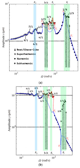 Figure 28 presents frequency–response curves of the VC parametric response of the model in Table 6. In this case, the equivalent resonant frequencies of the model are about ωx0 = 1463.75 rad/s and ωy0 = 370.74 rad/s. Compared to the case of δ0 = 4.0 μm in Section 4.2 (i.e., ωx0 = 1881.47 rad/s and ωy0 = 1047.21 rad/s), the resonant excitation frequencies fall a lot in Fukata’s model. Herein, the VC primary resonances as Ω rotates around ωx0/Nb = 182.97 rad/s and ωy0/Nb = 46.34 rad/s are also excited (i.e., the R1 and R3 ranges). These two primary resonances exhibit soft spring and soft–hard spring characteristics similar to the case of δ0 = 4.0 μm studied. Through supercritical and subcritical period-doubling bifurcations trigger at points F1 and F2, the 1/2-order subharmonic resonance in the horizontal direction is strong excited in a wide range R4 as Ω rotates around 2·ωy0/Nb = 92.68 rad/s, and VC period-2 resonant responses occur. It should be note that 2-order superharmonic resonance in the vertical direction dominates the resonant amplitude R6 in the vertical direction as Ω rotates around 1/2·ωx0/Nb = 91.48 rad/s, because the main frequency component of x(τ) in this range is 2-order harmonics (i.e., the response characteristics at Ω = 88 rad/s presented in Figure 29). Moreover, the period-2 solution branch F1-F2 undergoes period-doubling bifurcations at F3, F4, F5 and F6, generating period-4 branch F3-F4 and F5-F6. Especially, there are various VC motion types arising subsequently on branch F5-F6, including chaotic responses, and this branch contains the beat/chaos-like range b-b described by Fukata et al. [14] (see Figure 30).