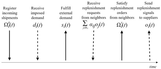 The stock replenishment process at a node (and thus the goods redistribution in the network) proceeds as a sequence of activities to be executed in each period (Figure 1):