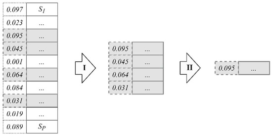 Four-way tournament selection in a P-size population {S1, …, SP}: I—random selection of four individuals, II—selection of the best (most fit) individual.
