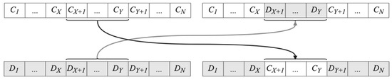 The recombination is performed through a crossover operation. In a given generation, a pair of RSL vectors (individuals) is used to create a pair of new vectors (children) by exchanging the genetic material in the form of the currently adjusted RSLs for a subset of nodes. Table 4 illustrates the influence of different crossover methods on the results of the CGA-based optimization in networked logistic systems. Accordingly, in the considered implementation, a multipoint crossover method was applied. This method consists of swapping the segments lying between uniformly distributed random points for each pair of parent individuals. The two-point crossover operation, employed in the implemented CGA (using more points did not improve the results, whereas it augmented the computations time) is illustrated in Figure 4. Two children are formed by swapping the segments of chromosomes between points X and Y, such that X, Y ∈ [0, N] and X ≠ Y in individuals C and D.