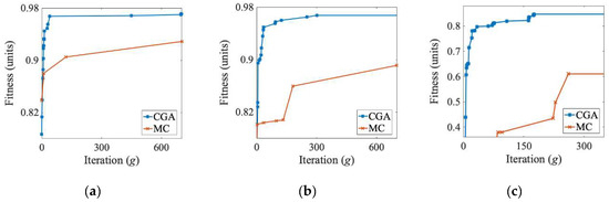 The performed numerical experiments showed that the fitness function value changed quickly in the initial phase of the optimization run, but less frequently afterward. Then, a sudden improvement of the fitness value may cause a short uptrend; however, the longer the time without changes, the higher the probability that the optimal solution has already been obtained. For this reason, two stop conditions were applied: an overall limit on the number of generations and a limit on the number of generations without fitness value improvements.