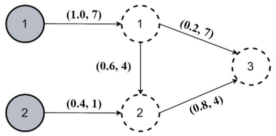 Figure 6 illustrates the topology of network N1. The network consisted of two external sources (grey circles) and three controlled nodes (dashed circles). The numbers displayed at the arrows indicate the SF and LTD, respectively. For instance, node 3 acquired 20% of goods from node 1 with a delay of 7 periods. The base holding cost obtained in the initial simulation run for the RSLs chosen according to (13) equaled 1.03 × 105 units. Although a non-sophisticated topology was considered with a granularity δ = 1 unit, the full search approach required exploring a space of over 109 potential solutions. While being time-consuming and inefficient for larger constructs, it formed the baseline for the CGA performance evaluation in the analyzed case of a small-sized network.