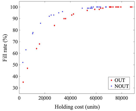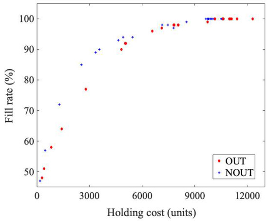Figure 11 depicts the performance measures obtained for the considered network topology and Table 9 groups the numerical data. When compared with the small-network case discussed in the previous section, larger differences can be noticed between the investigated policies, which were all in favor of the centralized strategy NOUT. In the analyzed case of the network from Figure 9, the cost savings for a given fill rate fell in the range of 5–43%. The biggest savings in the case of the better, centralized, policy, for both the full and partial customer satisfaction, are marked in bold in Table 9.