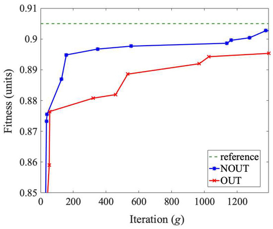 Figure 13 presents the changes in the fitness function in the CGA search process. The same business objectives as for network N1, parametrized using γ = 1 and φ = 20, were considered. Despite having initially better effectiveness in the case of the OUT policy, ultimately, in line with the theoretical assumptions, the search for the best RSLs for the NOUT policy continued to progress beyond the level established for the OUT one and approached the optimal selection more closely.