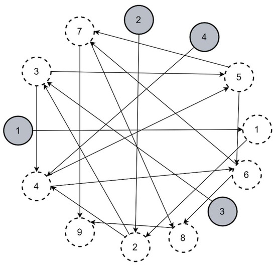 Network N2 encompassed four external sources and ten controlled nodes. The considered interconnection structure is illustrated in Figure 9. The lead-time delays were randomly selected from the range 1–7. The holding cost from the initial, worst-case simulation performed for the maximum persistent demand amounted to 7.73 × 105 units. The corresponding domain for the exhaustive search encompassed 1033 combinations, thus being infeasible for the common computing platforms. The comparison of the initial RSLs calculated for the controlled nodes using (15) and the optimal vector determined using CGA is visualized in Figure 10.