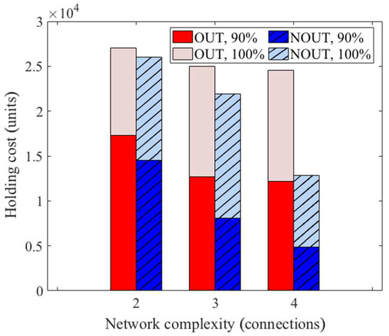 These observations are quite general. As was investigated for different network sizes and structural complexities, the cost-related benefits of the NOUT policy relative to the standard one grew for larger and more intricate topologies. Figure 12 summarizes the policy performances under different fill rate requirements. The bars represent three different topologies, involving three, four, and five supply nodes connected to each controlled node, respectively. The stacked bars reflect the overall holding cost for full (100%) and high (90%) customer satisfaction levels. As expected, the holding costs decreased when relaxing the fill rate objective. The gain from using the centralized policy relative to the standard one grew for more complex topologies. Interestingly, the holding costs decreased for more involved connectivity structures. This was probably caused by an averaging effect, i.e., although encompassing more nodes and having a denser linkage structure, the topology became more regular with respect to the connection specifics, e.g., the mean lead-time delay for a given node.