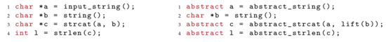 Imagine we are given symbolic bounds , then the first line of the transformed program createsmstringvalue with characters and bounds . In the following, we describe mstring values as pairs of these two arrays. The second line creates a symbolic index of arbitrary value. On line 3, the program constraints the index to be smaller than mstring maximal length. Otherwise, the update on the next line would yield an error. Next the program assigns to the position of abstract index a charactery. The assignment is implemented as update operation on mstring value. Depending on the value of the , the operations results in the following strings , as result we join all possibilities: