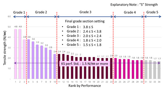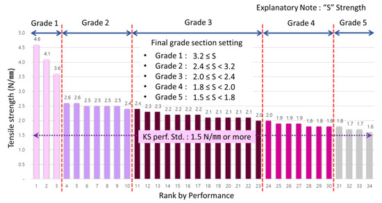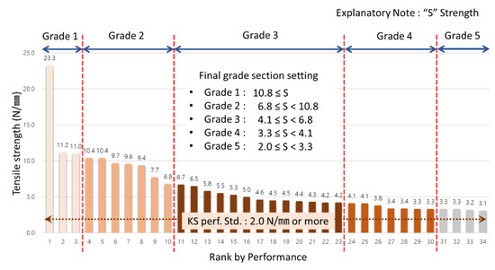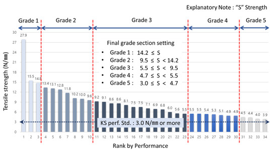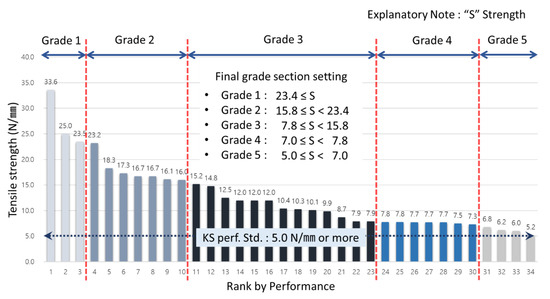 According to Table 7, to set grade section for standard test data value of low temperature −20 °C tensile strength, they were derived as grade 1 with 23.4 N/mm or more, grade 2 with 15.8 N/mm or more and less than 23.4 N/mm, grade 3 with 7.8 N/mm or more and less than 15.8 N/mm, grade 4 with 7.0 N/mm or more and less than 7.8 N/mm and grade 5 with 5.0 N/mm or more and less than 7.0 N/mm. To show these in graph, they were set as in the following Figure 6.