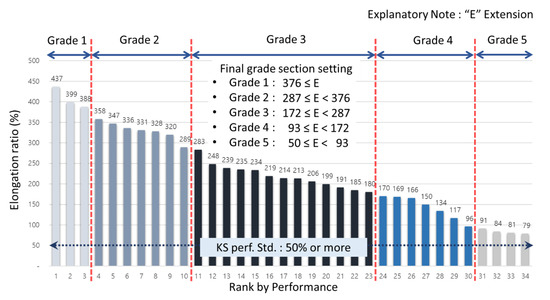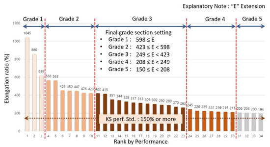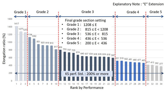 According to Table 7, to set grade section for standard test data value for elongation ratio between binding parts in case of fracture at low temperature −20 °C, they are as in the following Figure 7. Set sections were derived as grade 1 with 376% or more, grade 2 with 287% or more and less than 376%, grade 3 with 172% or more and less than 287%, grade 4 with 93% or more and less than 172% and grade 5 with 50% or more and less than 93%.