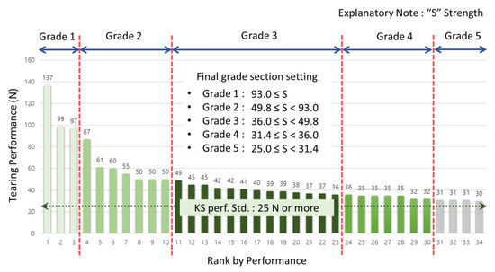 According to Table 7, tearing performances were derived as grade 1 with 93.0 N or more, grade 2 with 49.8 N or more and less than 93.0 N, grade 3 with 36.0 N or more and less than 49.8 N, grade 4 with 31.4 N or more and less than 36.0 N and grade 5 with 25 N or more and less than 31.4 N. To show these in graph, they were set as in the following Figure 3.