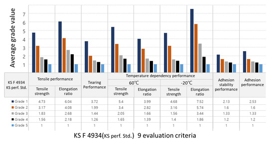 The proposed grading system has been applied to the existing 34 types (products) in Korea, evaluated by Korea’s national and public quality test institution, Seoul National University of Science and Technology Construction Technology Research Institute throughout the period of 2 years from 2018 to 2019. These products were selected on the basis that they pass the basic performance requirements outlined in the KS F 4934 standard. For the data range, 5 specimens for each of the testing and evaluation criteria (34 (products) × 9 (test and evaluation criteria) × 5 (No. of test pieces)) resulting in a total of 1530 performance result values were used to demonstrate the proposed grading system application on to the Korean products. Since it is difficult to state such a large number of data values in the article, values of 5 test pieces were averaged and presented for each criteria. As the following results and demonstration is intended to serve only as a proposal for a tool to overcome the limit of indiscriminately unified minimum quality performance standard used as standard in most countries including Korea, products discussed in this study will be limited to those in Korea, but necessity of standard gradation and the proceeding can be applied to any countries that require such similar grading system in consideration of their respective circumstances.