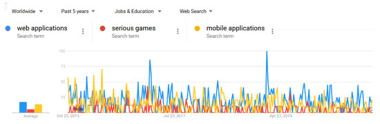 - Google. Google Trends. Available online: https://trends.google.com/trends/explore?cat=958&date=today 5-y&q=web applications,serious games,mobile applications (accessed on 22 October 2020).
