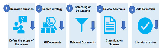 Figure 2 shows the review process consisting of five phases: (1) definition of the research questions to review the scope; (2) search strategy to obtain all documents; (3) screening of the documents to extract the most relevant documents; (4) keywording using abstracts for the classification scheme, and (5) data extraction and revision process to obtain the results of the systematic review.