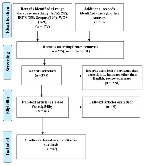 Phase 2: Screening. Here, we apply the inclusion and exclusion criteria. Of the 476 articles, 201 articles were excluded because they were duplicated in different databases, 275 articles were included. Then, in the following filter, we excluded studies written in a language other than English, review studies, abstracts, workshops, and studies on topics other than accessibility in serious games; we excluded a total of 228 studies; finally, a total of 47 reviews passed to the next phase.