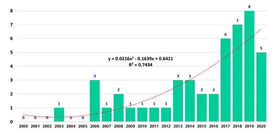 This analysis aims to respond to RQ1; Figure 4 shows the evolution of scientific production, presenting the number of documents each year. The years of most scientific output in accessibility in the serious games are 2018 and 2019. We found eight papers for 2019, which corresponds to 17%, seven documents for 2018, which corresponds to 14.9%. In 2017, we found six articles, corresponding to 12.8%. In 2020, we found five documents, which corresponds to 10.6%. It is expected that this number tends to increase because it was done until July 2020. In 2006, 2013, and 2014, there were three documents each year that add up to 19.1%. In 2008, 2015, and 2016, there were two items each year that add up to 12.8%. Finally, in 2003, 2007, 2009, 2010, 2011, and 2012, one document added up to 12.8% each year. The annual growth rate of the published articles follows the polynomial Equation (2).
