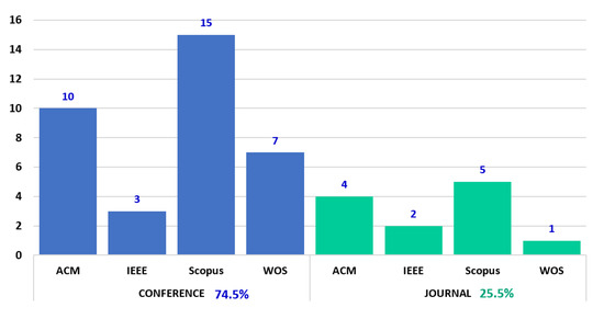 Figure 5 presents 35 conference studies representing 74.5% of the total and 12 journal articles representing 25.5%. In this review of the literature, the most significant number of studies found are concentrated in conferences. The largest number of documents are indexed in Scopus.