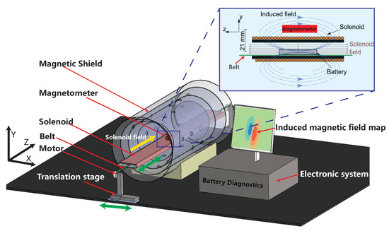 Experimental setup. A motor-driven conveyor belt moves the battery cell through a long solenoid, which can provide a constant background magnetic field. The magnetometer sensor is placed in the ultra-low-field region, above the solenoid, the solenoid is shown extending beyond the four-layer Twinleaf MS-2 magnetic shielding. The conveyor belt moves the battery back and forth along the z axis, while translation stages on each end move the entire belt with 0.1-mm precision along the x axis. (Inset) Side view of the experimental arrangement [25].