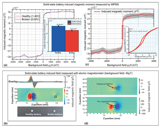 Figure 2a shows MPMS measurements for a healthy cell and one that was overheated above its highest working temperature of 80 C. As seen here, the m-H curves are indistinguishable. The inset shows that induced magnetic moment of the healthy battery at a background of T is somewhat stronger than that of the broken battery.