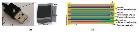 (a) Rechargeable solid-state battery (CeraCharge) from TDK Corporation (www.tdk-electronics.tdk.com). (b) Z–Y cross-section view of the battery [33].