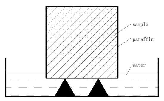 Two cube specimens with a side length of 70.7 mm were prepared according to the mixing ratio of each group and maintained in a curing room at a temperature of 20 ± 2 °C with a relative humidity of more than 95% for 28 days. The average of the test results of the two specimens was considered to be the absorption mass per unit area of each group at different intervals of time. Once the test specimens had dried to a constant weight at 105 °C, five faces of each sample were sealed using paraffin, and the remaining surface (bottom surface) was reserved as a water absorption surface (see Figure 1). The original mass M0 (g) of all the test samples was recorded before the test. The water level was maintained at about 3–5 mm above the water absorption surface, the ambient temperature was 20 ± 2 °C, and the relative humidity was about 75% ± 5%. The mass Mt (g) of each specimen was recorded at regular intervals until it stabilized.