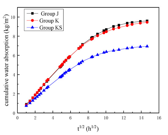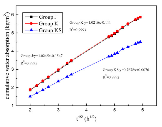 According to the linear expression obtained from the fitted curve, the capillary water absorption coefficients of the J, K, and KS groups were 1.0245, 1.0216, and 0.7678 (kg/m2)/h1/2, respectively.