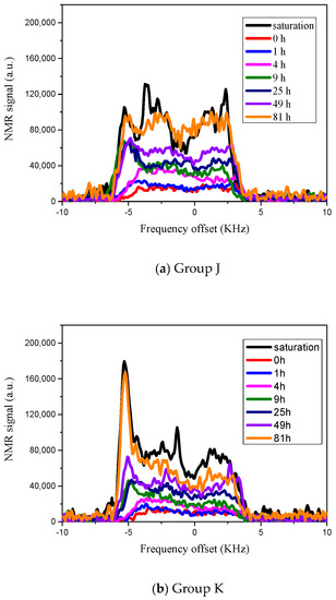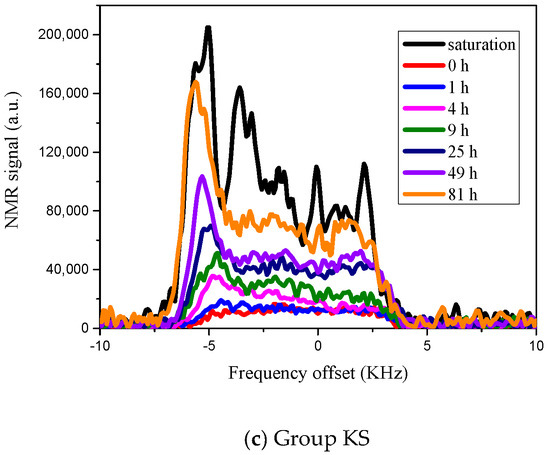 Analyzing the moisture content in concrete by conventional methods is difficult. Wormald and Britch were the first to evaluate the moisture content in construction materials using neutron and gamma-ray diffraction [9]. Subsequently, accurate and non-destructive experimental methods, such as the hygrometer method [10], wave propagation [11,12,13], thermal transmittance testing [14,15,16], electrical property testing methods [17,18], and nuclear magnetic resonance (NMR) [19,20,21,22], have gradually been developed. However, each of these methods has its own disadvantages. The gamma-ray test method requires a dry sample and cannot be used for on-site or in-situ testing. The hygrometer method requires many test holes to be prepared on the sample and the accuracy is not high. NMR technology is a fast, accurate, non-destructive, and continuous measurement method. Moreover, samples can be tested without drying or injecting liquids. Consequently, NMR technology can be used for in-situ detection and continuous monitoring. It measures the relaxation behavior of hydrogen protons in water molecules inside the material to obtain information such as the state of water, total moisture content [19,20], and distribution of water in the pores [21,22,23]. Nunes et al. analyzed NMR-T2 relaxation to obtain pore water distribution at different distances from the material interface [24]. Stelzner et al. found the reconfiguration process of moisture from smaller gel pores to larger interhydrate pores by 1H-NMR—relaxometry [25].