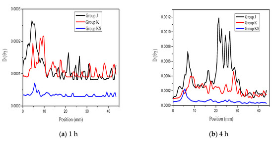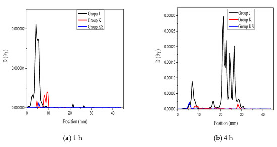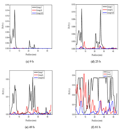 , the water diffusion coefficient, is a function that describes the strength of water transport and is positively correlated to porosity. Consequently, the number of pores in the section where the peak surface appears can be assumed to be high. Comparing the curves of group J at 1 and 4 h, as shown in Figure 7, a new peak appeared at 20–30 mm; at 49 h, another new peak appeared near 40 mm. Essentially, as the test time increases, the surface moisture continuously spreads into the material. When it is transmitted to a relatively loose section, it appears as a more obvious peak on the curve. Therefore, by observing the position and time of each peak in the graph, the distribution of the sample density can be evaluated and the approximate depth of water infiltration can be determined. The group K curve also followed a similar law. However, the undulation of the curve was small, which implied that the waterproofing agent effectively improved the compactness of the cement mortar. The group KS curve showed almost no obvious peak during the entire test period, which indicated that nano-SiO2 further improved the pore distribution of the cement mortar sample and reduced the pore size.