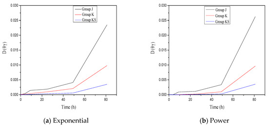 Considering the form of , calculating the above equation is difficult. Therefore, a relatively simple form of the water diffusion coefficient is required. Currently, the most common formulae are the exponential function and the power function, which are as follows [47,48]: