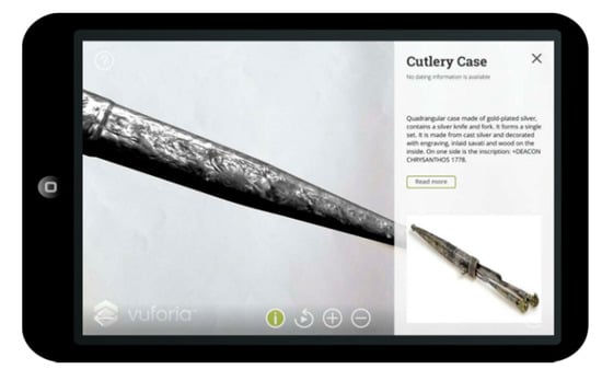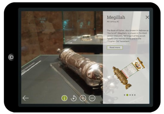 Figure 1), or it allows a virtual projection of animated 3D objects when available. There is an underlying multilingual support system, and currently, the information and educational content are provided to visitors in the English and Greek languages. Exhibitions in the Ioannina Silversmithing museum are mostly static and thus, in a hand-held AR setting, the object projection is expected to be performed in standard positions in the physical museum settings and in view of the visitor’s distance to the object. Our solution has been technically tested for working at a distance up to 1.5 m from the artefact (