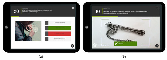 Figure 3a), they ask people to revisit museum collections, search for artefacts with specific characteristics, and scan them with the camera of their tablet. The AR app will recognize the featured object as a correct choice and will reward the user with symbolic awards (collected points and user visibility on a top-ten leaderboard). For example, in the app’s prompt: “Identify in the museum’s collections of secular artifacts a pen-case with an incorporated inkpot or otherwise “Kalamari””, users have to go back and look for the silver pen-case, such as in a treasure hunt game (