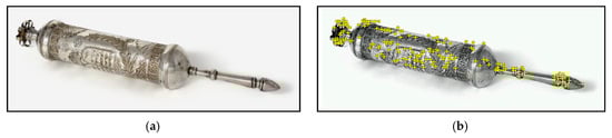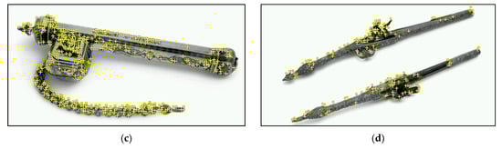 Figure 4d) could improve the overall rating of the marker, but such modifications were not applied, since the markers are museum artefacts themselves, and any cropping could lead to a poor visual representation of the historical objects. Finally, the real object is being detected as its characteristics are compared with the characteristics of the models that are known in advance as a marker [