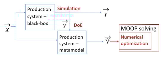The scheme in Figure 1 illustrates the procedure of a metamodel implementation to the MOOP solving in a production environment. Vector  represents system inputs that will be transformed to outputs . The model structure and its configuration affect the system performance. Thus, mapping input parameters (production system loading) to outputs–production objectives, such as costs, flow time, or product quantities can be observed. Due to the fact that the direct analytical expression of this mapping is unknown, we consider the simulation model of a production system as a black box and the mapping of inputs to outputs as a black-box transformation. All the information about it can be gained from the simulation. The simulation model of a production system (production system black-box in Figure 1) serves as a data source for building the surrogate model instead of a black-box function of the underlying simulation model. Simulation experiments need to consider the design of the experimental layout originated from DoE when evaluating the production objectives as outputs of the simulation runs. Once the production objectives have been evaluated, DoE adopts the observed production goals as responses  according to the suggested design of the planned experiment. The derived regression models (production system metamodel in Figure 1) estimate the values of production goals . These regression models by means of individual objective functions represent metamodels as analytically expressed transformations of inputs  for the selected simulation model of a production system.