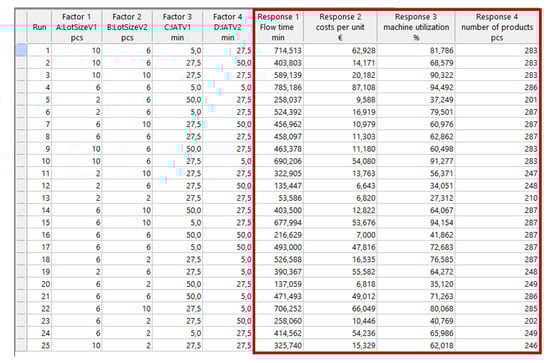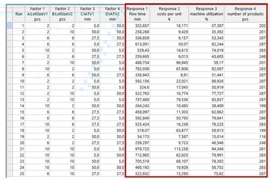 To construct the metamodel of the production objectives, we were interested in two different experimental designs—the Box–Behnken Design (BBD) and Face-Centered Design (FCD). They were selected to explore and compare the suitability of both main types of spherical vs. cuboidal designs for the derivation of a metamodel of a simulation model. After screening experiments, we considered four factors on three levels (–1, 0, 1) in both types of experimental design and four responses F1–F4, representing the selected production goals (Table 1). The factorial space was a four-dimensional domain, with lower and upper bounds between values 2 and 10 pcs for the lot size and between 5 and 50 min for the product arrival time of both products. As responses, four selected production performance indicators were considered: the total number of products, average flow time, average machine utilization, and average costs per part unit. Both designs required 25 simulation runs each. The values of responses in each of the experimental points were found by simulation in Witness Horizon by Lanner Group Limited, Houston, TX, USA (see Figure 2 and Figure 3, respectively). The BBD design layout for the actual values of the settings factors with the added responses that resulted from the simulation are shown in Figure 2. Similarly, Figure 3 depicts the experimental scheme with an added four responses for FCD.