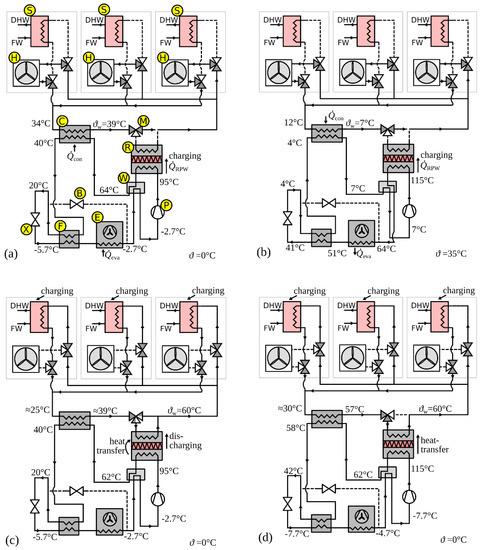 In the case that the thermal energy for DHW generation cannot be provided entirely by operating mode (c), e.g., during spring, the HP switches to the direct DHW generation mode (d). In this mode, similar to a conventional system, DHW is generated by increasing the condensing temperature to values suitable for DHW. The RPW-HEX acts in this case solely as HEX and transfers the sensible energy of the hot gas directly to process water. During transitional seasons, it would make sense to bypass the RPW-HEX on the refrigerant side (not depicted in the figure) to avoid unnecessary charging/discharging of the RPW-HEX. In operating mode (e) and (f), the RPW-HEX is fully charged, and the modes are comparable to conventional heating and cooling modes.