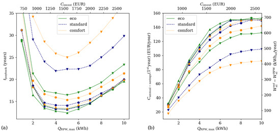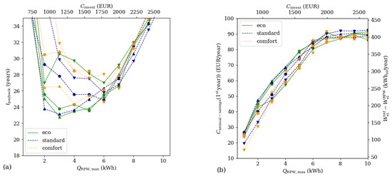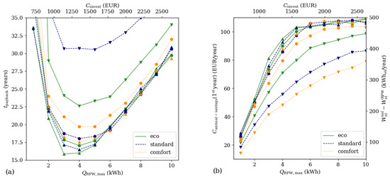 After that, the increase in energy savings becomes significantly smaller (and the payback time starts to increase, see Figure 2a). Therefore, it makes no sense to increase the RPW-HEX storage size beyond this point. For a system operating in standard-mode with medium DHW storage devices, the payback time is still 14.1 years and annual savings are 557 kWhel/year or at least 122 EUR/year, respectively. For small DHW storage devices (140 L) operating in standard- or comfort-mode, the payback time is always more than 20 years.