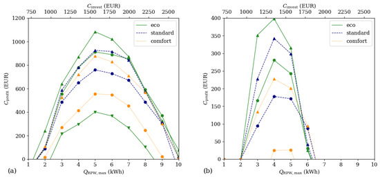 Profit after 20 years of operation for (a) Case #1 (passive house located in Helsinki) and (b) Case #2 (low energy building located in Strasbourg). Markers “▼”, “●” and “▲” denote small (140 L), medium (210 L) and large (280 L) decentralized DHW storage devices. Please note that for some cases, no profit can be made after 20 years of operation, so they are not shown in the figures.