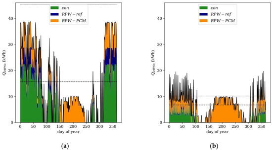 Daily DHW consumption and provided energy for energy efficient DHW generation by operating mode (c) QDHW,c for (a) Case #1 and (b) Case #3 and variations from Table 3. The different colors mark the contribution from the condenser (“con”, green), from the refrigerant transferred via the RPW-HEX (“RPW-ref”, blue) and from the energy stored in the PCM-material/aluminum (“RPW-PCM”, orange). The dotted line marks the average DHW consumption and the dashed line mark the average contribution of DHW to the DHW consumption by operating mode (c).