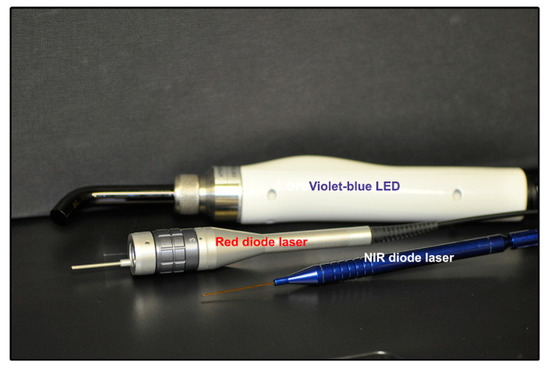 PBM treatments were performed by using two diode lasers one emitting at λ = 635 ± 5 nm and the other one (GaAlAs laser) emitting at λ = 808 ± 10 nm or by using a LED emitting at λ = 405 ± 5 nm (Dental Laser System 4 × 4TM, General Project Ltd., Montespertoli, Florence, Italy). The three light devices are included in a single instrument. Detailed device specifications and parameters are reported in Table 1.