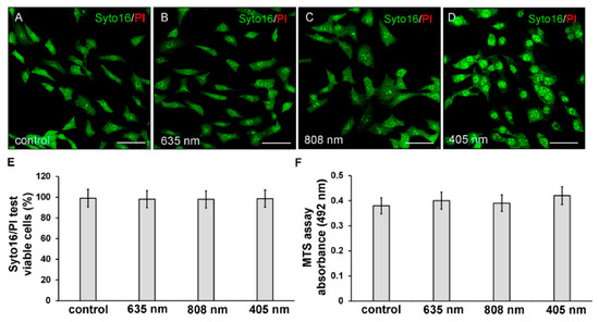 Evaluation of cell viability of NIH/3T3 fibroblasts performed 24 h after cell exposure to red (635 nm), NIR (808 nm) and violet-blue (405 nm) PBM. Cells not subjected to PBM treatments served as control. (A–E) Syto16/PI test. (A–D) Representative confocal fluorescence micrographs of cells stained for Syto16 (green) and PI (red). Scale bar: 50 µm. (E,F) Histograms displaying (E) the morphometric analysis of the percentage of Syto16 positive viable cells and (F) the absorbance of colored formazan formed by viable cells. p > 0.05.