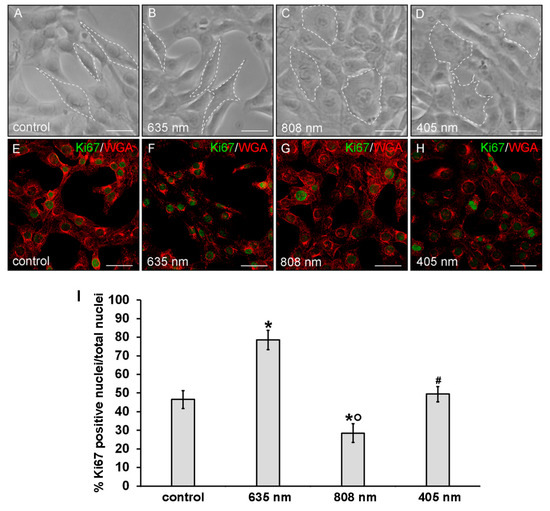 Evaluation of the morphology and of proliferation capability of NIH/3T3 fibroblasts performed 24 h after cell exposure to red (635 nm), NIR (808 nm) and violet-blue (405 nm) PBM. Cells not subjected to PBM treatments served as control. (A–D) Representative phase contrast images of cells observed under an inverted phase contrast microscope. Scale bar: 20 µm. White dotted lines were depicted to better visualize the cell shape. (E–H) Representative confocal fluorescence micrographs of fixed cells immunostained with antibodies against the nuclear proliferation marker Ki67 (green) and stained with Tetramethylrhodamine-conjugated WGA membrane dye (red). Scale bar: 50 µm. (I) Histogram showing the percentage of cells with Ki67 positive nuclei. Significance of difference: * p < 0.01 vs. control; ○ p < 0.01 vs. 635 nm; # p < 0.01 vs. 808 nm; p = 0.06, 405 nm vs. control.