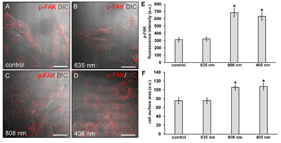 Confocal immunofluorescence analysis of p-FAK expression in NIH/3T3 fibroblasts performed 24 h after cell exposure to red (635 nm), NIR (808 nm) and violet-blue (405 nm) PBM. Cells not subjected to PBM treatments served as control. (A–D) Representative superimposed differential interference contrast (DIC) and confocal fluorescence micrographs simultaneously acquired of the cells immunostained for p-FAK (red) detection, showing the cellular localization of the protein. DIC images allow appreciating the different morphology of the cells subjected to PBM treatments. Scale bar: 30 µm. (E) Histogram of the densitometric analysis of p-FAK fluorescence intensity performed on digitized images. Significance of difference: * p < 0.01 vs control (808 nm, p = 0.0017; 405 nm, p = 0.0033); p = 0.89, 635 nm vs. control; p = 0.997, 405 nm vs. 808 nm. (F) Histogram showing the measure of cell surface area calculated on digitized DIC images by using ImageJ as indicated in Materials and Methods. Significance of difference: * p < 0.01 vs. control (808 nm, p = 0.0098; 405 nm, 0.0051); p = 0.99, 635 nm vs. control; p = 0.89, 405 nm vs. 808 nm.