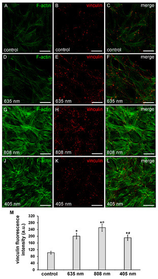 By contrast, cells subjected to red PBM displayed a reduction in the staining of F-actin filaments which seem to be “less assembled”, as compared to control cells. Of note, these cells showed an up-regulation of vinculin expression levels (Figure 5A–F,M).