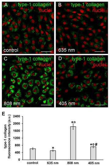 Confocal immunofluorescence analysis of type-1 collagen expression in NIH/3T3 fibroblasts performed 5 days after cell exposure to red (635 nm), NIR (808 nm) and violet-blue (405 nm) PBM. Cells not subjected to PBM treatments served as control. (A–D) Representative confocal fluorescence micrographs of fixed cells immunostained to detect type-1 collagen (green). Nuclei are labeled in red with PI. Scale bar: 50 µm. (E) Histogram showing the densitometric analysis of type-1 collagen fluorescence intensity performed on digitized images. Significance of difference: * p < 0.01 vs. control; ○ p < 0.01 vs. 635 nm; # p < 0.01 vs. 808 nm.