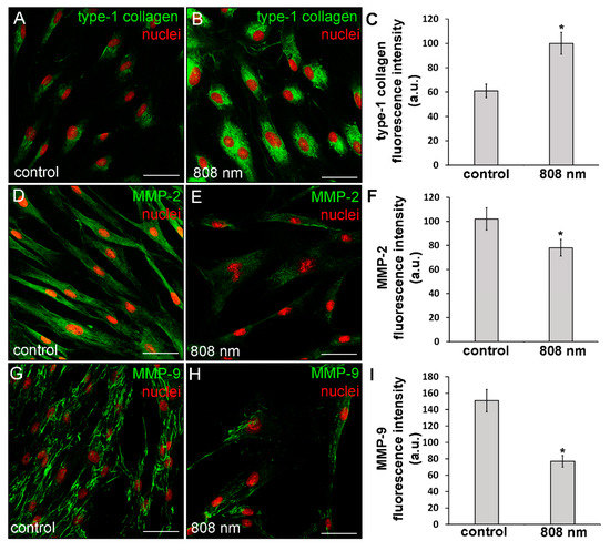 Confocal immunofluorescence analysis of the expression of type-1 collagen, MMP-2 and MMP-9 in HDF-α fibroblasts 24 h (MMPs) or 5 days (type-1 collagen) after exposure to NIR (808 nm) PBM. Cells not subjected to PBM treatments served as control. (A,B,D,E,G,H) Representative confocal fluorescence micrographs of fixed cells immunostained for detection of (A,B) type-1 collagen, (D,E) MMP-2 and (G,H) MMP-9 (green). Nuclei are labeled in red with PI. Scale bar: 50 µm. (C,F,I) Histograms showing the densitometric analysis of (C) type-1 collagen, (F) MMP-2 and (I) MMP-9 fluorescence intensity performed on digitized images. Significance of difference: * p < 0.01 vs. control.