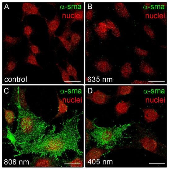 Confocal immunofluorescence analysis of α-sma expression in NIH/3T3 fibroblasts performed 24 h after cell exposure to red (635 nm), NIR (808 nm) and violet-blue (405 nm) PBM. (A–D) Representative confocal fluorescence micrographs of fixed cells immunostained to detect α-sma (green). Nuclei are marked in red with PI. Scale bar: 25 µm.