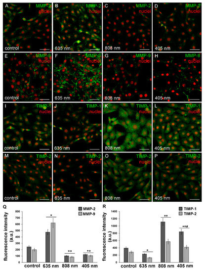 In particular, MMP-2 resulted mainly distributed in the cytoplasm with a spotted staining (Figure 9A–D) whereas MMP-9 was localized along the cytoskeletal filaments (Figure 9E–H). Both TIMP-1 and TIMP-2 appeared evenly distributed within the cytoplasm (Figure 9I–P). Likewise, murine fibroblasts, HDF-α, 24 h after NIR PBM treatment, down-regulated the expression of MMP-2 (Figure 7D–F) and MMP-9 (Figure 7G–I).